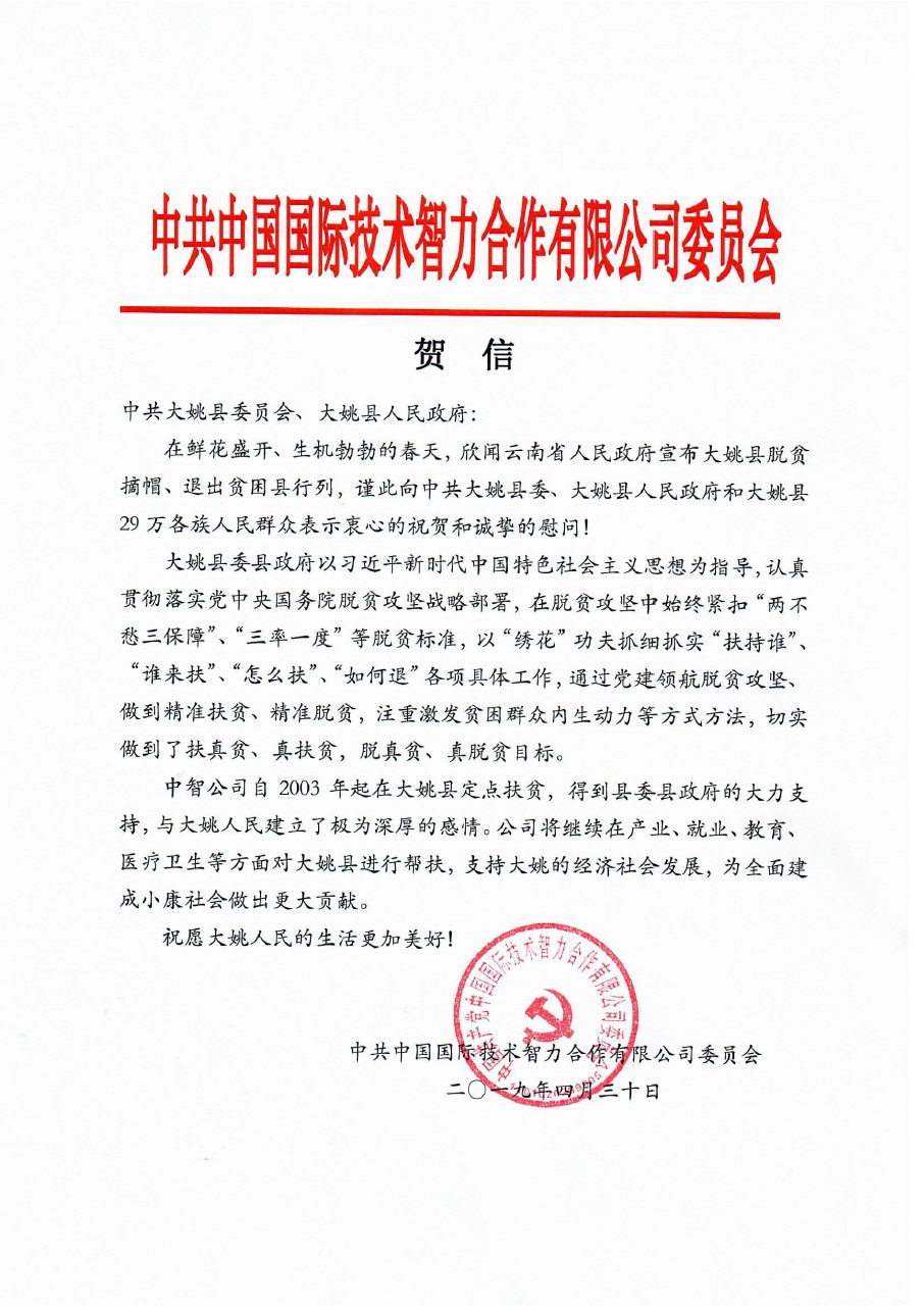 2019年4月30日,云南省人民政府新聞辦在昆明海埂會堂玉蘭廳舉行云南省2018年33個貧困縣(市、區)退出新聞發布會。中智公司定點幫扶的云南省楚雄州大姚縣達到脫貧標準,成功退出貧困序列。