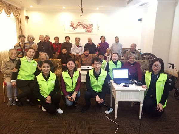 活動現場,老人們的學習熱情高漲,跟隨志愿者老師學習簡單英語口語,并且積極參與課堂活動。志愿者們還耐心教老人們如何使用微信等新型社交工具,幫助他們運用所學英語語句和親人朋友發送語音消息。