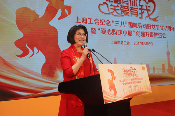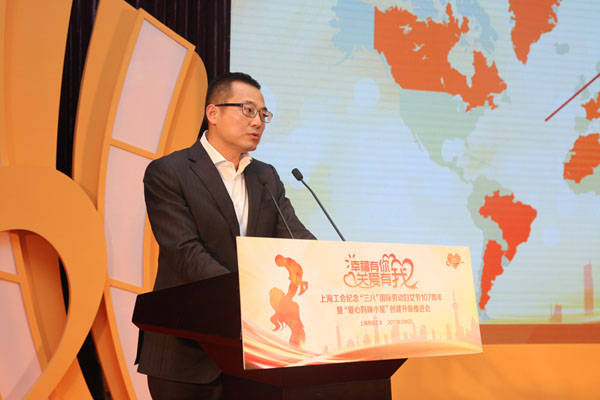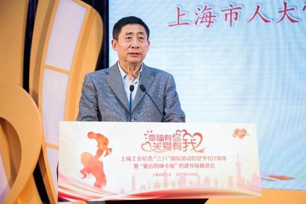 上海市人大常委會副主任、市總工會主席洪浩首先針對關(guān)愛女職工實施服務(wù),維護女職工各項權(quán)益為主題進行致辭。