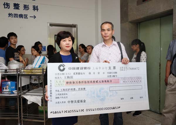 2015年9月1日,瑞金醫(yī)院灼傷科病房外,一張47萬元的支票由中智集團(tuán)副總經(jīng)理王慧遞交給了火海英雄、“中智好雇員”王海濱的父親,這其中包含著無數(shù)的牽掛和關(guān)愛,“我們是代表所有募捐者來傳達(dá)我們的關(guān)心,希望海濱能盡早康復(fù),也希望你們能保重身體。”