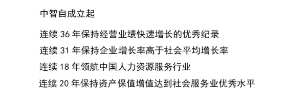 2005年起,中智榮登由中國企業聯合會、中國企業家協會頒布的中國服務業企業500強;獲亞太人力資源研究協會、《財智》雜志“最佳HR綜合服務機構獎”